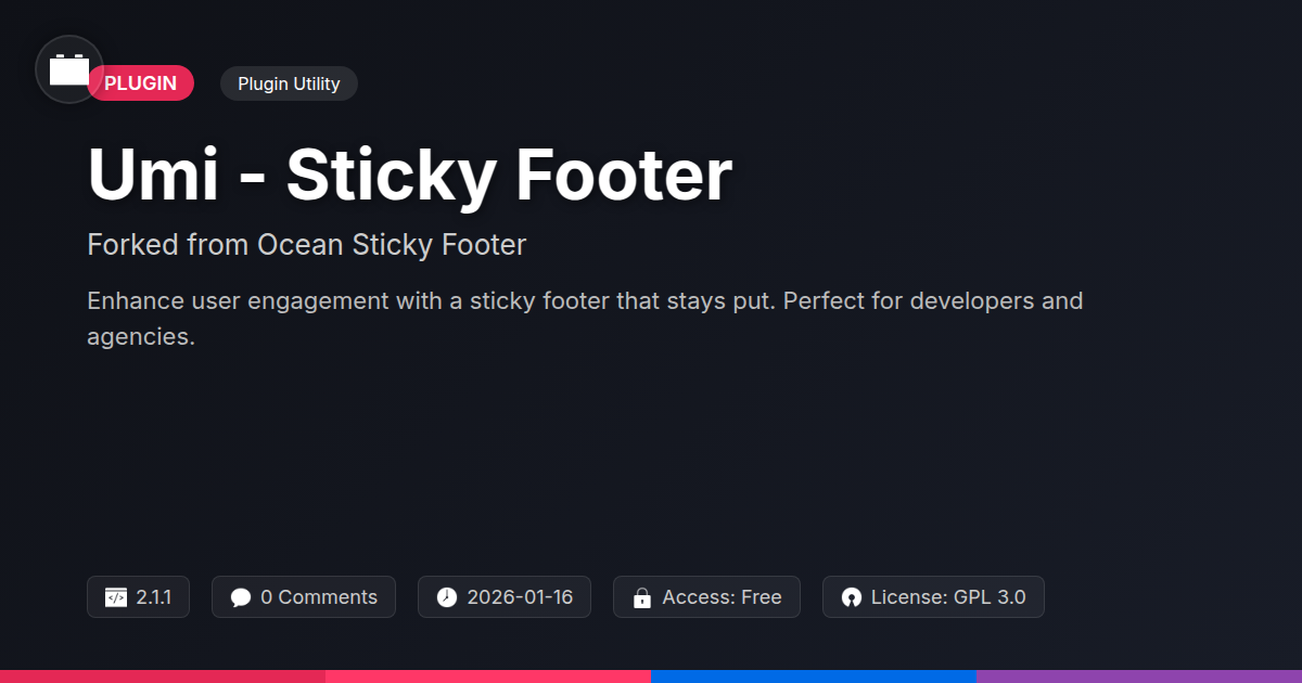 But what if there was a way to bring that persistent presence to your footer, a way that’s built on a solid, well-tested foundation, offering the flexibility developers crave and the simplicity agencies love? Imagine a tool that understands your workflow, plays nice with your existing setup, and actually makes your life easier. No more reinventing the wheel. No more existential dread over footer placement. Just a clean, efficient solution that delivers. This is where Umi - Sticky Footer, forked from a beloved original, steps in. It’s not just about sticking something to the bottom of the screen; it’s about adding a smart, unobtrusive functional element that enhances user experience and keeps your key messages front and center, all while keeping your sanity intact.