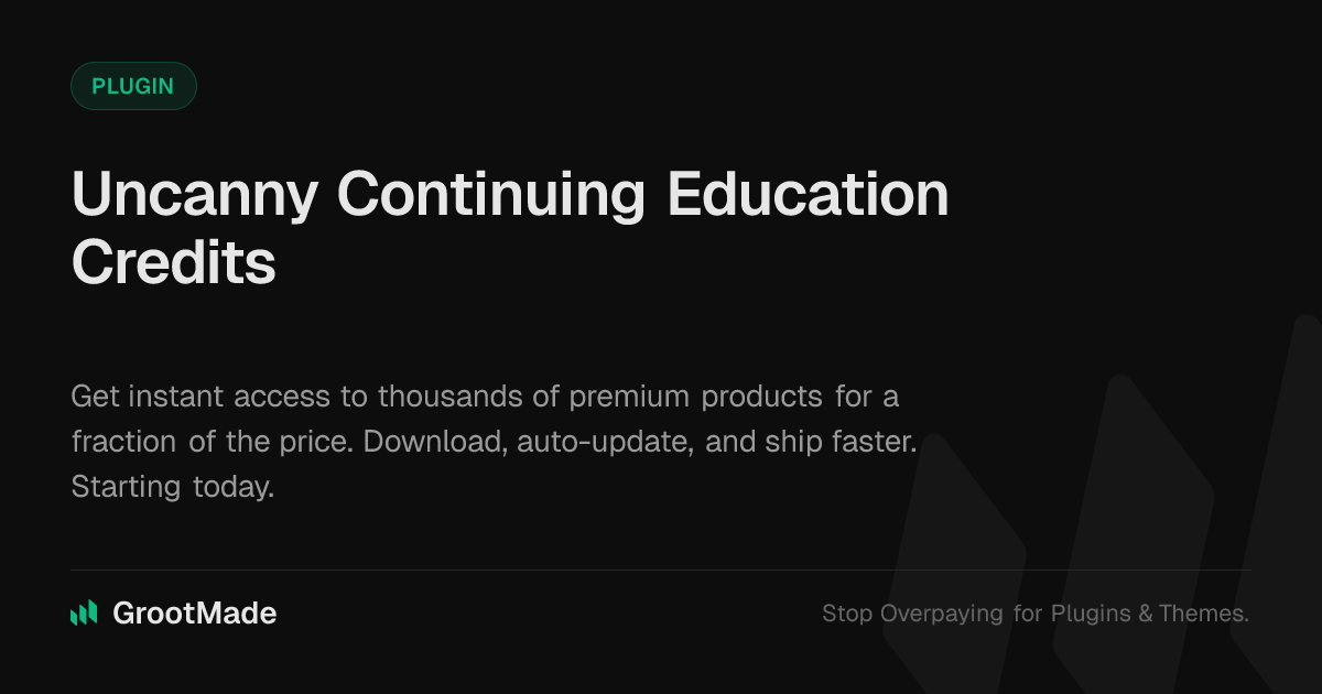 GrootMade is NOT affiliated with Uncanny Continuing Education Credits or its original author. Uncanny Continuing Education Credits™ is a trademark of its respective owner and use of it does not imply any endorsement or affiliation. This product has been forked under the GNU General Public License (GPL) and all non-GPL assets (such as proprietary images, fonts, and branding) have been removed. Distributing GPL-licensed code is 100% legal.