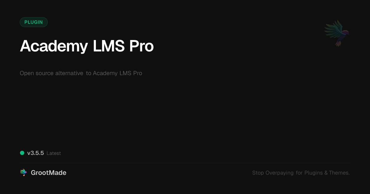 GrootMade is NOT affiliated with Academy LMS Pro or its original author. Academy LMS Pro™ is a trademark of its respective owner and use of it does not imply any endorsement or affiliation. This product has been forked under the GNU General Public License (GPL) and all non-GPL assets (such as proprietary images, fonts, and branding) have been removed. Distributing GPL-licensed code is 100% legal.