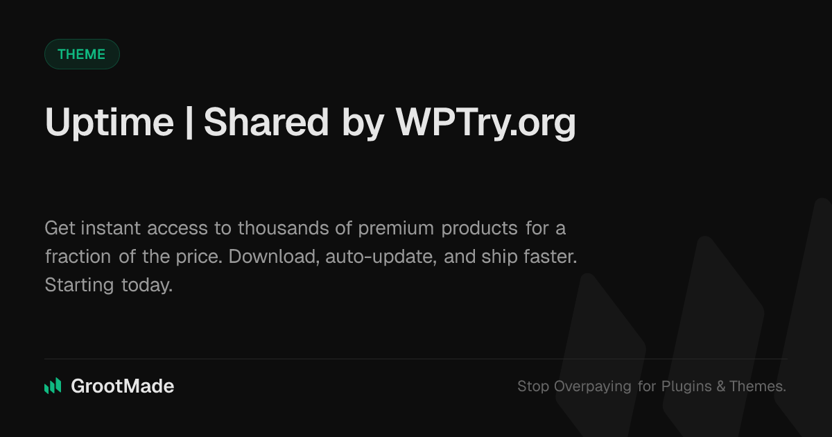 GrootMade is NOT affiliated with Uptime | Shared by WPTry.org or its original author. Uptime | Shared by WPTry.org™ is a trademark of its respective owner and use of it does not imply any endorsement or affiliation. This product has been forked under the GNU General Public License (GPL) and all non-GPL assets (such as proprietary images, fonts, and branding) have been removed. Distributing GPL-licensed code is 100% legal.