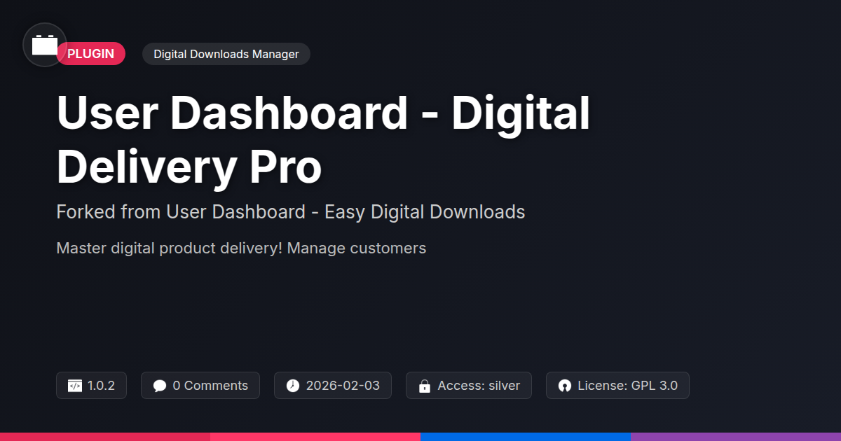 GrootMade is NOT affiliated with User Dashboard - Easy Digital Downloads or its original author. User Dashboard - Easy Digital Downloads™ is a trademark of its respective owner and use of it does not imply any endorsement or affiliation. This product has been forked under the GNU General Public License (GPL) and all non-GPL assets (such as proprietary images, fonts, and branding) have been removed. Distributing GPL-licensed code is 100% legal.