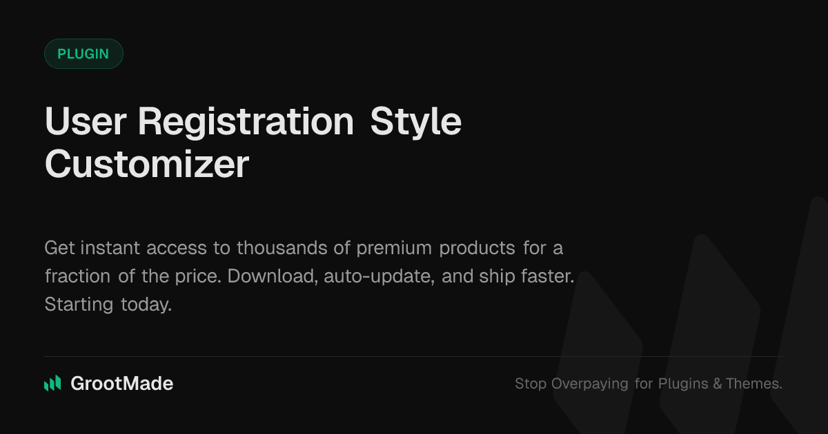 GrootMade is NOT affiliated with User Registration Style Customizer or its original author. User Registration Style Customizer™ is a trademark of its respective owner and use of it does not imply any endorsement or affiliation. This product has been forked under the GNU General Public License (GPL) and all non-GPL assets (such as proprietary images, fonts, and branding) have been removed. Distributing GPL-licensed code is 100% legal.