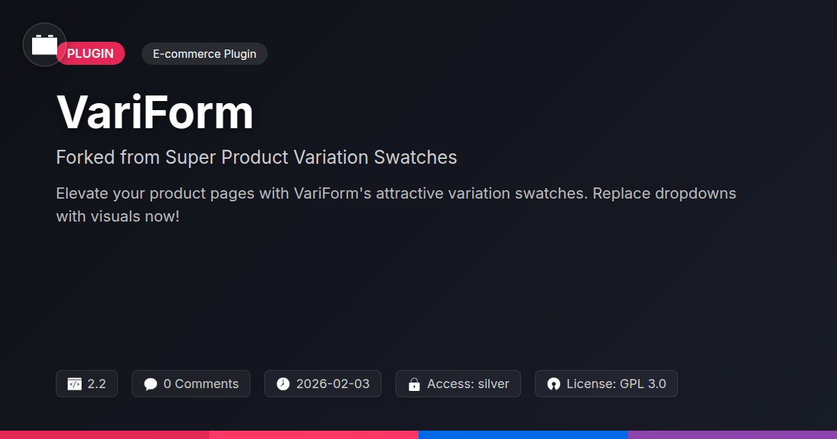 Tired of those clunky, ancient dropdown menus dictating your customers' shopping experience? You know the ones – the digital equivalent of sifting through a sock drawer blindfolded. If you've ever stared at your meticulously designed product pages, only to see them marred by uninspired select boxes, then you're probably already nodding along. We get it. As developers, agencies, and proud champions of open-source solutions, we strive for elegance and functionality in every aspect of our digital creations. Yet, when it comes to presenting product variations, many platforms leave us feeling like we're back in the dial-up era. Enter VariForm. If you're looking to inject some serious visual flair and user-friendliness into your product pages without breaking a sweat (or your budget), you've stumbled upon something rather special. This isn't just another plugin; it's a meticulously crafted solution designed to appease both the pixel-pushing designer in you and the pragmatic developer who needs things to just work. We've taken a beloved, robust tool and given it a fresh coat of paint, ensuring it remains a powerhouse for anyone building e-commerce sites on the leading web development framework. Whether you're slinging artisanal coffee beans, bespoke widgets, or anything in between, VariForm is here to elevate your product presentation from drab to fab. So, let's ditch those tired dropdowns and explore how VariForm can help you create a more engaging and conversion-driving shopping experience. Ready to make your product pages actually pop?