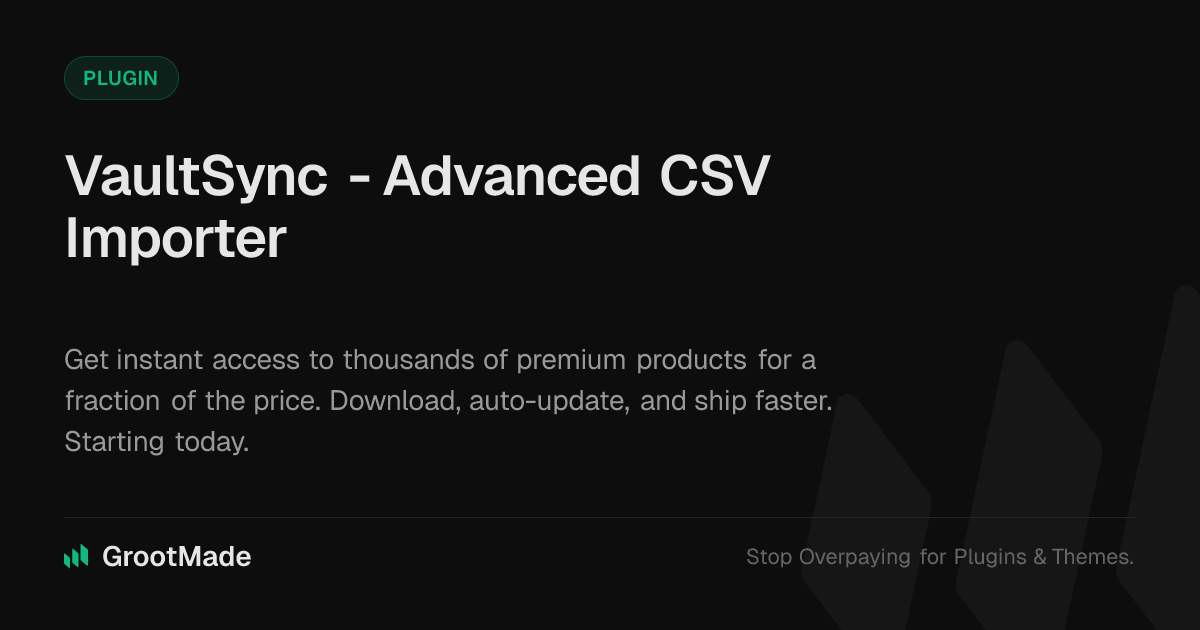 GrootMade is NOT affiliated with WPDM - Advanced CSV Importer or its original author. WPDM - Advanced CSV Importer™ is a trademark of its respective owner and use of it does not imply any endorsement or affiliation. This product has been forked under the GNU General Public License (GPL) and all non-GPL assets (such as proprietary images, fonts, and branding) have been removed. Distributing GPL-licensed code is 100% legal.