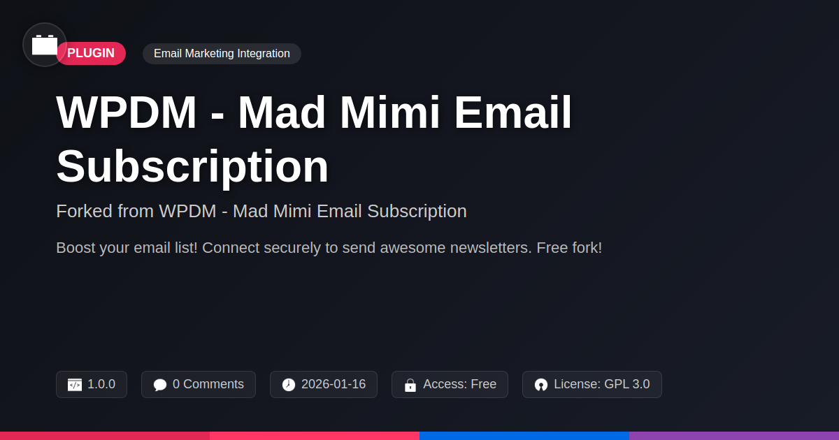 GrootMade is NOT affiliated with WPDM - Mad Mimi Email Subscription or its original author. WPDM - Mad Mimi Email Subscription™ is a trademark of its respective owner and use of it does not imply any endorsement or affiliation. This product has been forked under the GNU General Public License (GPL) and all non-GPL assets (such as proprietary images, fonts, and branding) have been removed. Distributing GPL-licensed code is 100% legal.