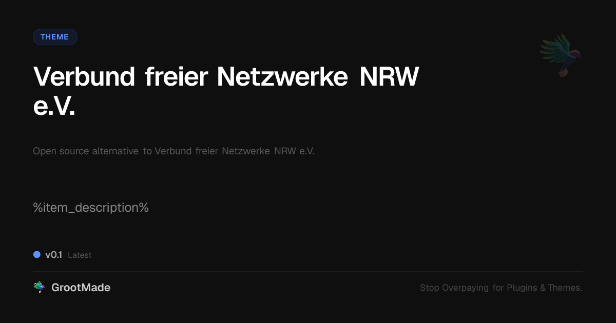 GrootMade is NOT affiliated with Verbund freier Netzwerke NRW e.V. or its original author. Verbund freier Netzwerke NRW e.V.™ is a trademark of its respective owner and use of it does not imply any endorsement or affiliation. This product has been forked under the GNU General Public License (GPL) and all non-GPL assets (such as proprietary images, fonts, and branding) have been removed. Distributing GPL-licensed code is 100% legal.