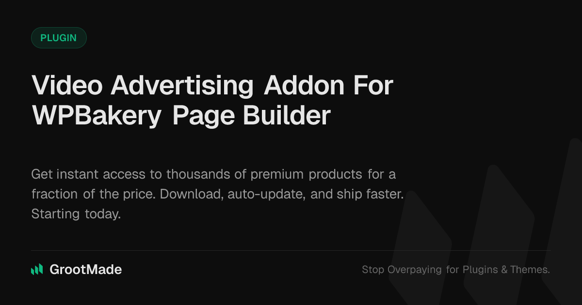 GrootMade is NOT affiliated with Video Advertising Addon For WPBakery Page Builder or its original author. Video Advertising Addon For WPBakery Page Builder™ is a trademark of its respective owner and use of it does not imply any endorsement or affiliation. This product has been forked under the GNU General Public License (GPL) and all non-GPL assets (such as proprietary images, fonts, and branding) have been removed. Distributing GPL-licensed code is 100% legal.
