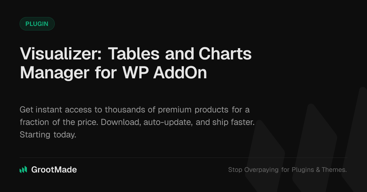 GrootMade is NOT affiliated with Visualizer: Tables and Charts Manager for WordPress AddOn or its original author. Visualizer: Tables and Charts Manager for WordPress AddOn™ is a trademark of its respective owner and use of it does not imply any endorsement or affiliation. This product has been forked under the GNU General Public License (GPL) and all non-GPL assets (such as proprietary images, fonts, and branding) have been removed. Distributing GPL-licensed code is 100% legal.