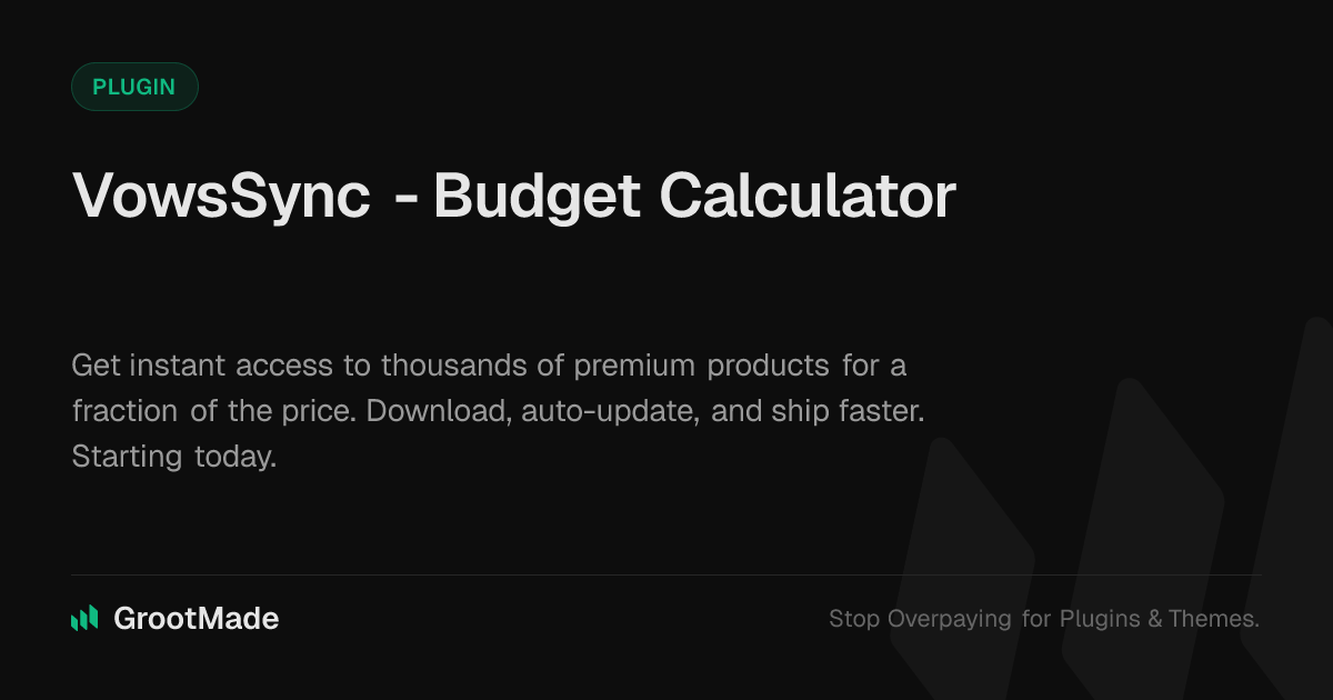 GrootMade is NOT affiliated with WeddingDir - Budget Calculator or its original author. WeddingDir - Budget Calculator™ is a trademark of its respective owner and use of it does not imply any endorsement or affiliation. This product has been forked under the GNU General Public License (GPL) and all non-GPL assets (such as proprietary images, fonts, and branding) have been removed. Distributing GPL-licensed code is 100% legal.