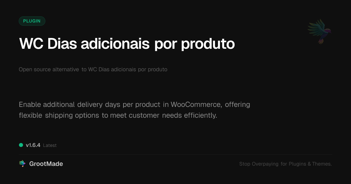 GrootMade is NOT affiliated with WC Dias adicionais por produto or its original author. WC Dias adicionais por produto™ is a trademark of its respective owner and use of it does not imply any endorsement or affiliation. This product has been forked under the GNU General Public License (GPL) and all non-GPL assets (such as proprietary images, fonts, and branding) have been removed. Distributing GPL-licensed code is 100% legal.
