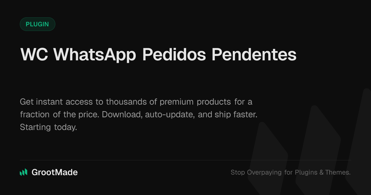 GrootMade is NOT affiliated with WC WhatsApp Pedidos Pendentes or its original author. WC WhatsApp Pedidos Pendentes™ is a trademark of its respective owner and use of it does not imply any endorsement or affiliation. This product has been forked under the GNU General Public License (GPL) and all non-GPL assets (such as proprietary images, fonts, and branding) have been removed. Distributing GPL-licensed code is 100% legal.
