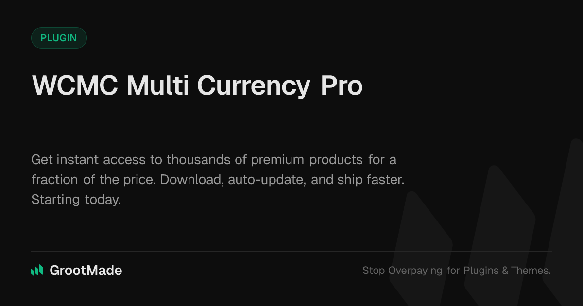 GrootMade is NOT affiliated with WCMC Multi Currency Pro or its original author. WCMC Multi Currency Pro™ is a trademark of its respective owner and use of it does not imply any endorsement or affiliation. This product has been forked under the GNU General Public License (GPL) and all non-GPL assets (such as proprietary images, fonts, and branding) have been removed. Distributing GPL-licensed code is 100% legal.