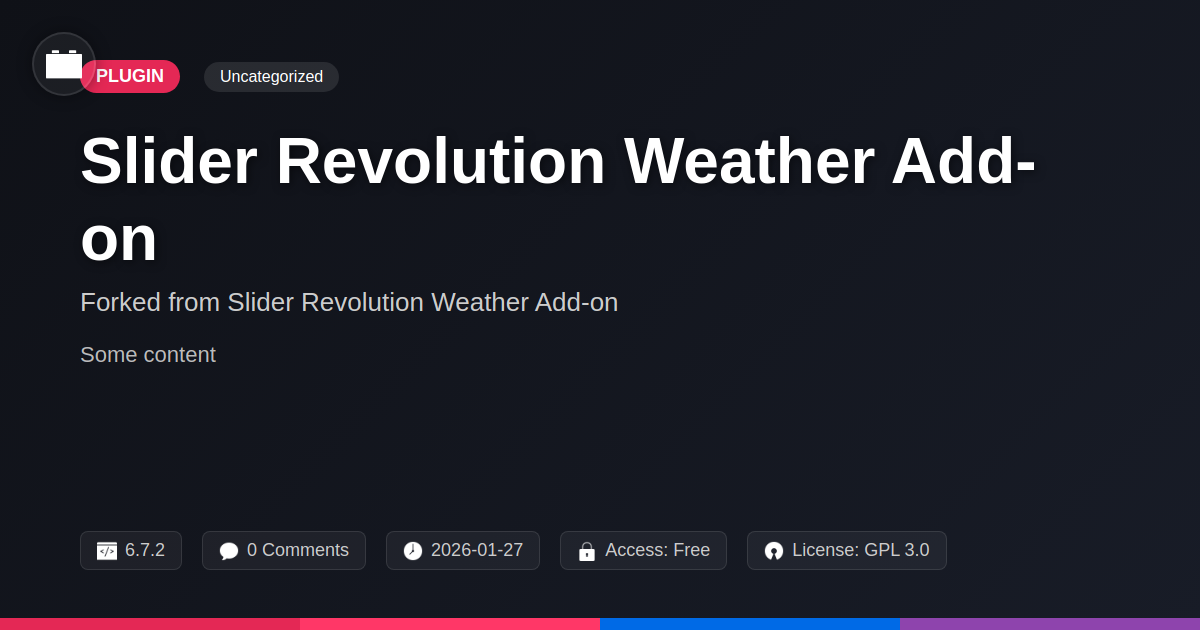 GrootMade is NOT affiliated with Slider Revolution Weather Add-on or its original author. Slider Revolution Weather Add-on™ is a trademark of its respective owner and use of it does not imply any endorsement or affiliation. This product has been forked under the GNU General Public License (GPL) and all non-GPL assets (such as proprietary images, fonts, and branding) have been removed. Distributing GPL-licensed code is 100% legal.