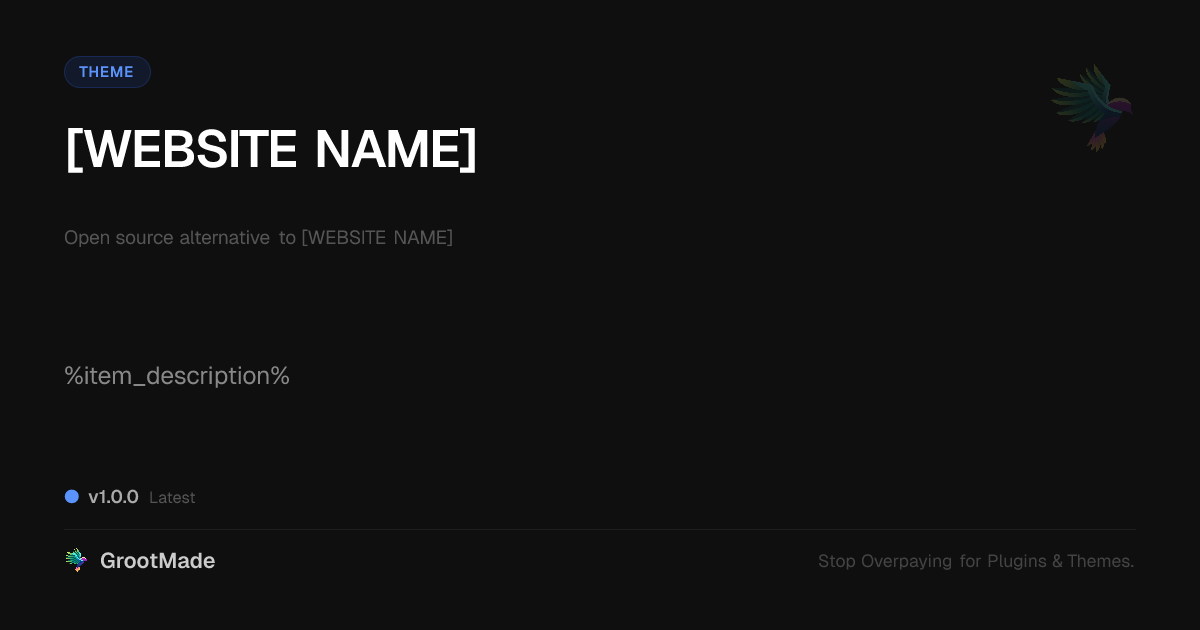 GrootMade is NOT affiliated with [WEBSITE NAME] or its original author. [WEBSITE NAME]™ is a trademark of its respective owner and use of it does not imply any endorsement or affiliation. This product has been forked under the GNU General Public License (GPL) and all non-GPL assets (such as proprietary images, fonts, and branding) have been removed. Distributing GPL-licensed code is 100% legal.