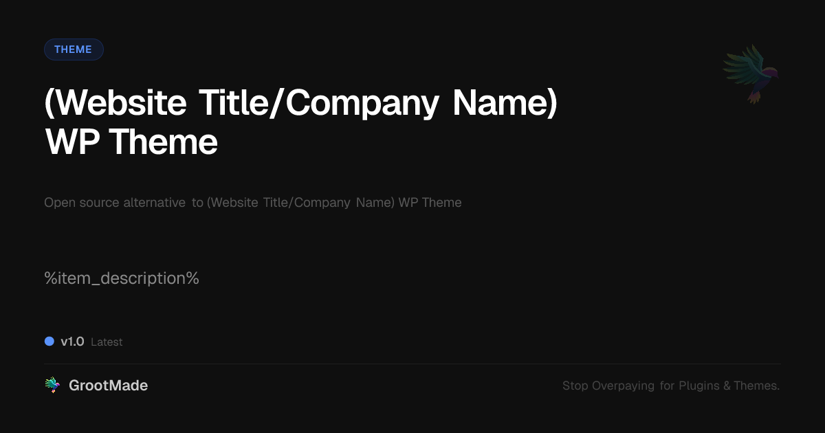 GrootMade is NOT affiliated with (Website Title/Company Name) WP Theme or its original author. (Website Title/Company Name) WP Theme™ is a trademark of its respective owner and use of it does not imply any endorsement or affiliation. This product has been forked under the GNU General Public License (GPL) and all non-GPL assets (such as proprietary images, fonts, and branding) have been removed. Distributing GPL-licensed code is 100% legal.
