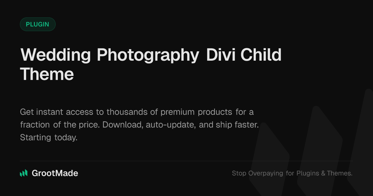 GrootMade is NOT affiliated with Wedding Photography Divi Child Theme or its original author. Wedding Photography Divi Child Theme™ is a trademark of its respective owner and use of it does not imply any endorsement or affiliation. This product has been forked under the GNU General Public License (GPL) and all non-GPL assets (such as proprietary images, fonts, and branding) have been removed. Distributing GPL-licensed code is 100% legal.