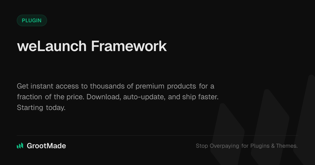 GrootMade is NOT affiliated with weLaunch Framework or its original author. weLaunch Framework™ is a trademark of its respective owner and use of it does not imply any endorsement or affiliation. This product has been forked under the GNU General Public License (GPL) and all non-GPL assets (such as proprietary images, fonts, and branding) have been removed. Distributing GPL-licensed code is 100% legal.