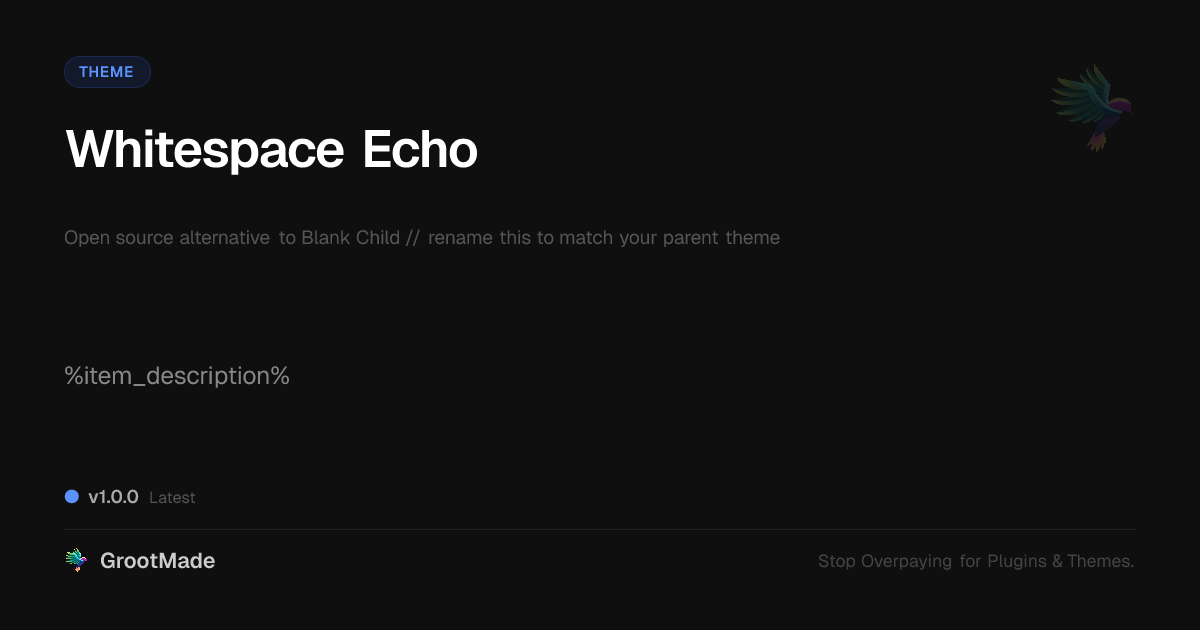GrootMade is NOT affiliated with Blank Child // rename this to match your parent theme or its original author. Blank Child // rename this to match your parent theme™ is a trademark of its respective owner and use of it does not imply any endorsement or affiliation. This product has been forked under the GNU General Public License (GPL) and all non-GPL assets (such as proprietary images, fonts, and branding) have been removed. Distributing GPL-licensed code is 100% legal.