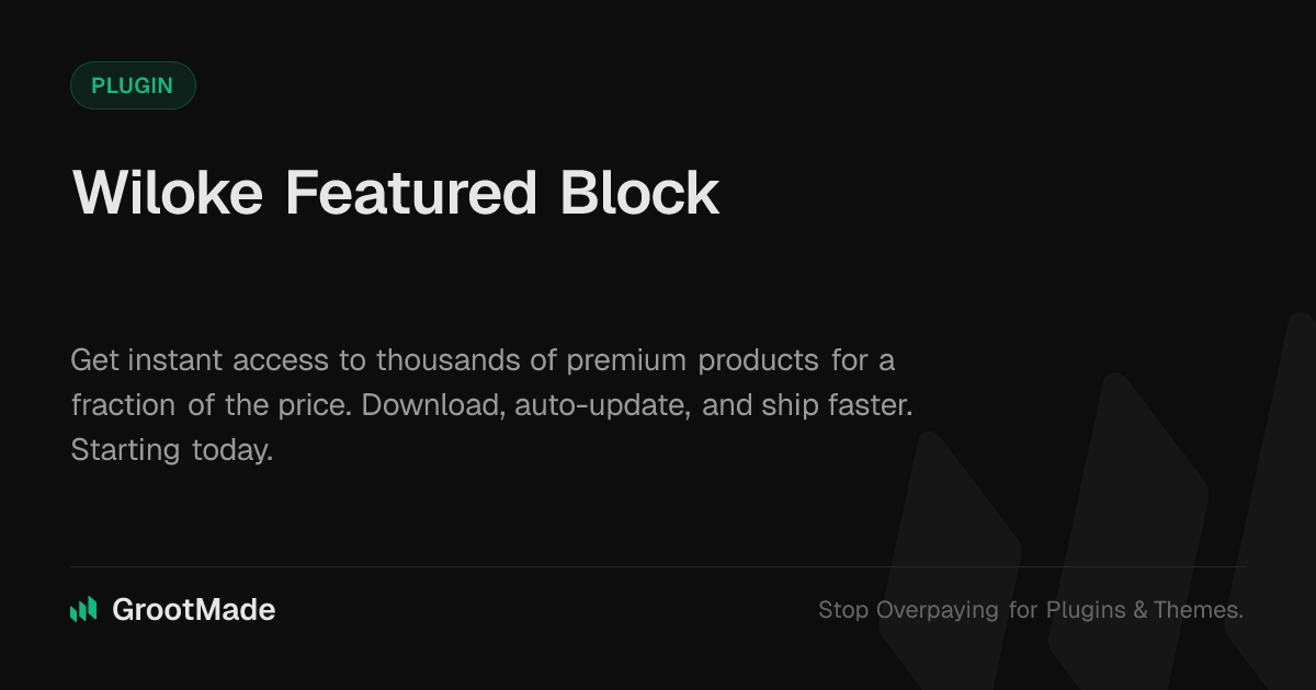 GrootMade is NOT affiliated with Wiloke Featured Block or its original author. Wiloke Featured Block™ is a trademark of its respective owner and use of it does not imply any endorsement or affiliation. This product has been forked under the GNU General Public License (GPL) and all non-GPL assets (such as proprietary images, fonts, and branding) have been removed. Distributing GPL-licensed code is 100% legal.