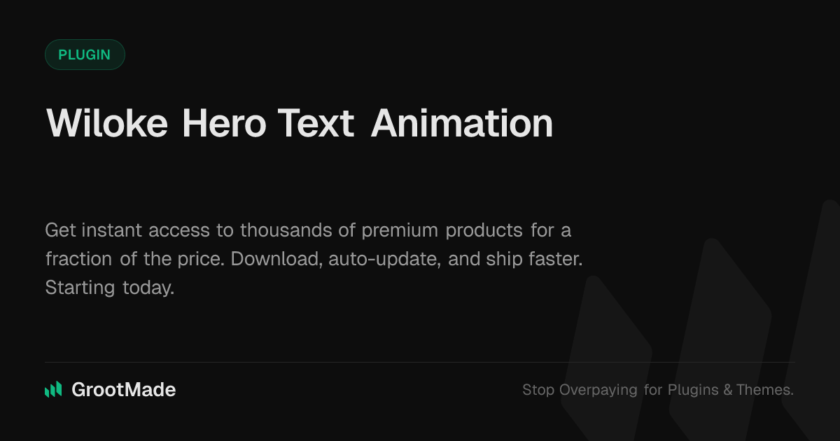 GrootMade is NOT affiliated with Wiloke Hero Text Animation or its original author. Wiloke Hero Text Animation™ is a trademark of its respective owner and use of it does not imply any endorsement or affiliation. This product has been forked under the GNU General Public License (GPL) and all non-GPL assets (such as proprietary images, fonts, and branding) have been removed. Distributing GPL-licensed code is 100% legal.