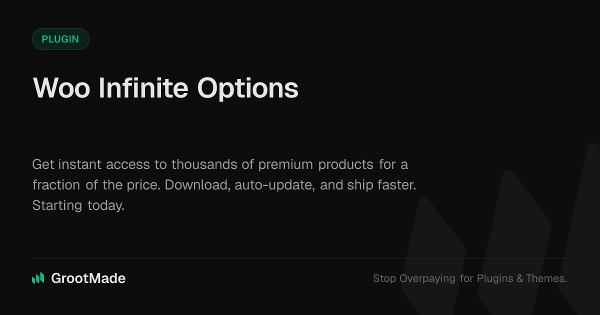 GrootMade is NOT affiliated with Woo Infinite Options or its original author. Woo Infinite Options™ is a trademark of its respective owner and use of it does not imply any endorsement or affiliation. This product has been forked under the GNU General Public License (GPL) and all non-GPL assets (such as proprietary images, fonts, and branding) have been removed. Distributing GPL-licensed code is 100% legal.