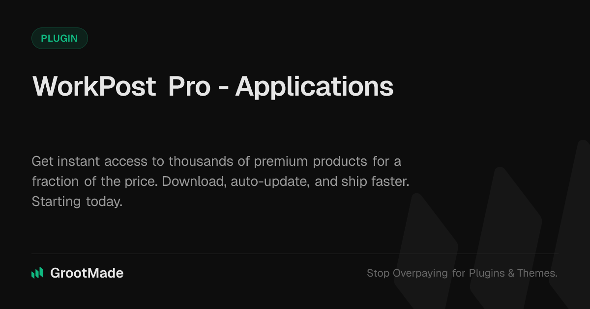 GrootMade is NOT affiliated with WP Job Manager - Applications or its original author. WP Job Manager - Applications™ is a trademark of its respective owner and use of it does not imply any endorsement or affiliation. This product has been forked under the GNU General Public License (GPL) and all non-GPL assets (such as proprietary images, fonts, and branding) have been removed. Distributing GPL-licensed code is 100% legal.
