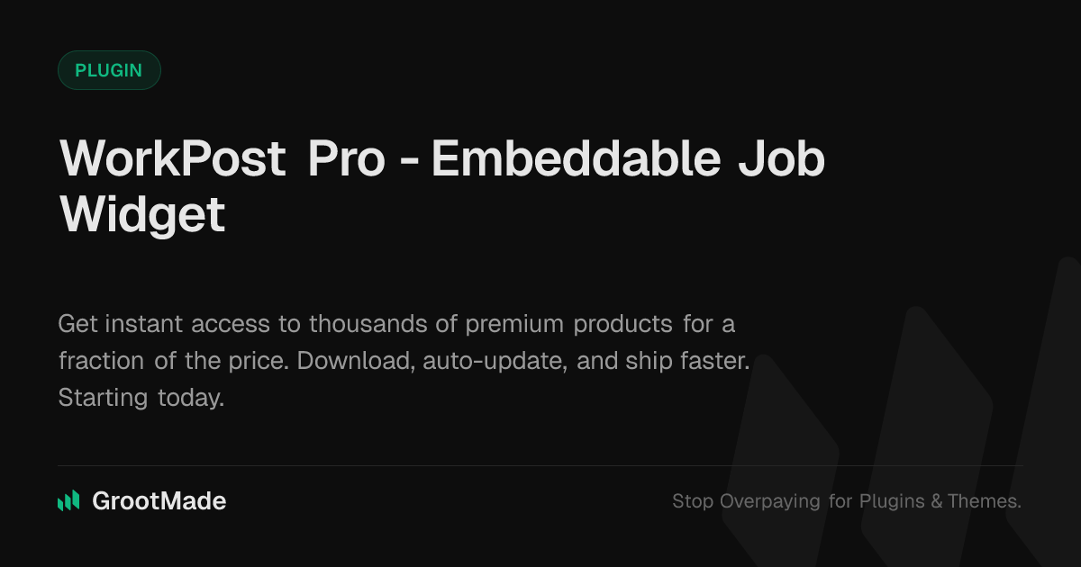 GrootMade is NOT affiliated with WP Job Manager - Embeddable Job Widget or its original author. WP Job Manager - Embeddable Job Widget™ is a trademark of its respective owner and use of it does not imply any endorsement or affiliation. This product has been forked under the GNU General Public License (GPL) and all non-GPL assets (such as proprietary images, fonts, and branding) have been removed. Distributing GPL-licensed code is 100% legal.