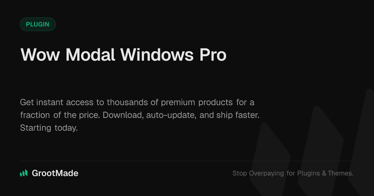 GrootMade is NOT affiliated with Wow Modal Windows Pro or its original author. Wow Modal Windows Pro™ is a trademark of its respective owner and use of it does not imply any endorsement or affiliation. This product has been forked under the GNU General Public License (GPL) and all non-GPL assets (such as proprietary images, fonts, and branding) have been removed. Distributing GPL-licensed code is 100% legal.