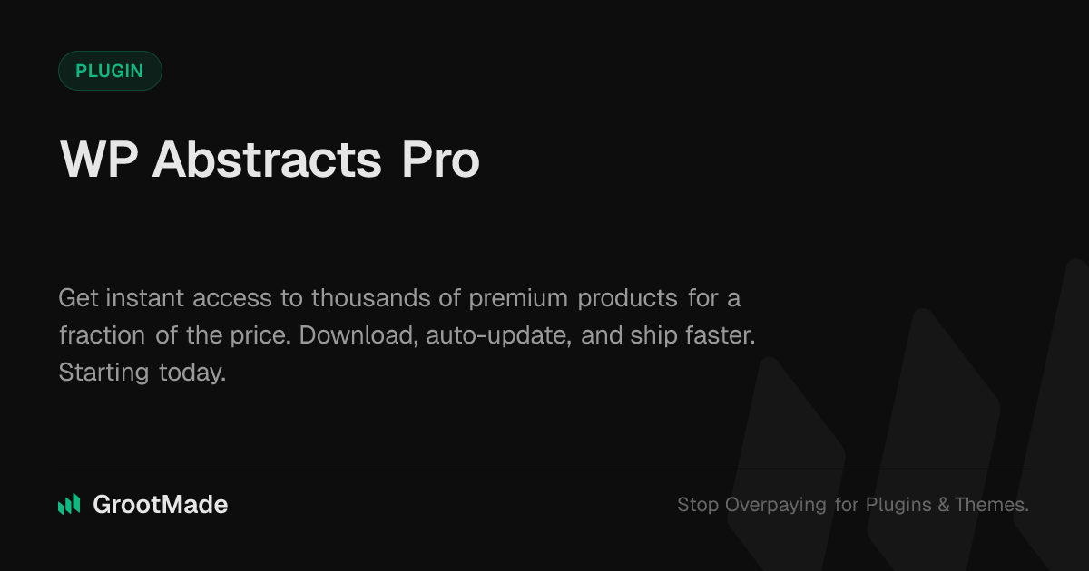 GrootMade is NOT affiliated with WP Abstracts Pro or its original author. WP Abstracts Pro™ is a trademark of its respective owner and use of it does not imply any endorsement or affiliation. This product has been forked under the GNU General Public License (GPL) and all non-GPL assets (such as proprietary images, fonts, and branding) have been removed. Distributing GPL-licensed code is 100% legal.