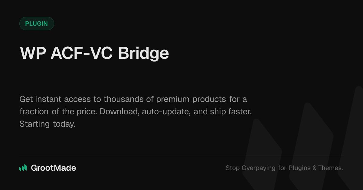 GrootMade is NOT affiliated with WP ACF-VC Bridge or its original author. WP ACF-VC Bridge™ is a trademark of its respective owner and use of it does not imply any endorsement or affiliation. This product has been forked under the GNU General Public License (GPL) and all non-GPL assets (such as proprietary images, fonts, and branding) have been removed. Distributing GPL-licensed code is 100% legal.
