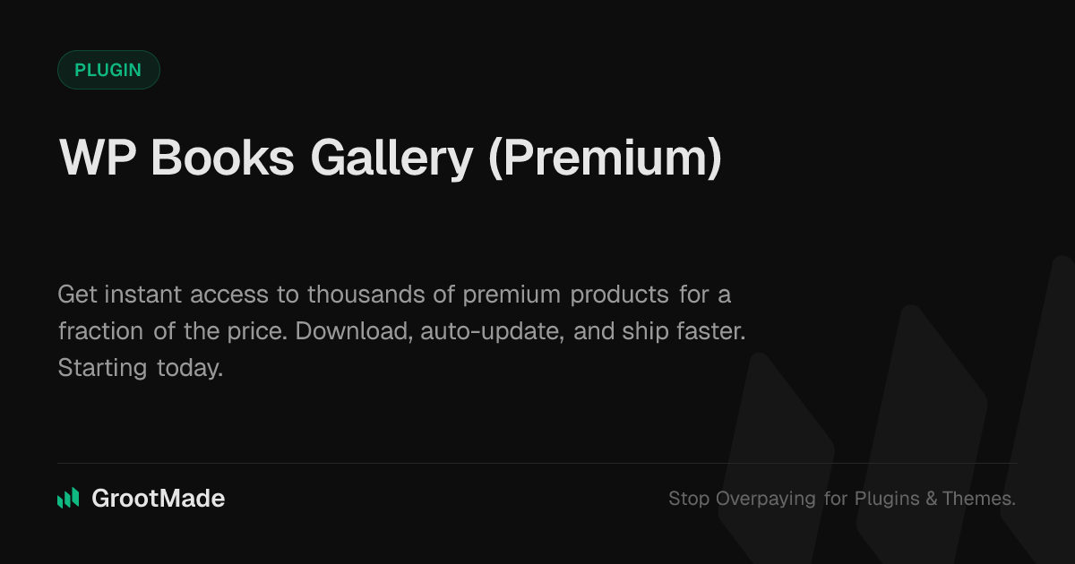 GrootMade is NOT affiliated with WordPress Books Gallery (Premium) or its original author. WordPress Books Gallery (Premium)™ is a trademark of its respective owner and use of it does not imply any endorsement or affiliation. This product has been forked under the GNU General Public License (GPL) and all non-GPL assets (such as proprietary images, fonts, and branding) have been removed. Distributing GPL-licensed code is 100% legal.