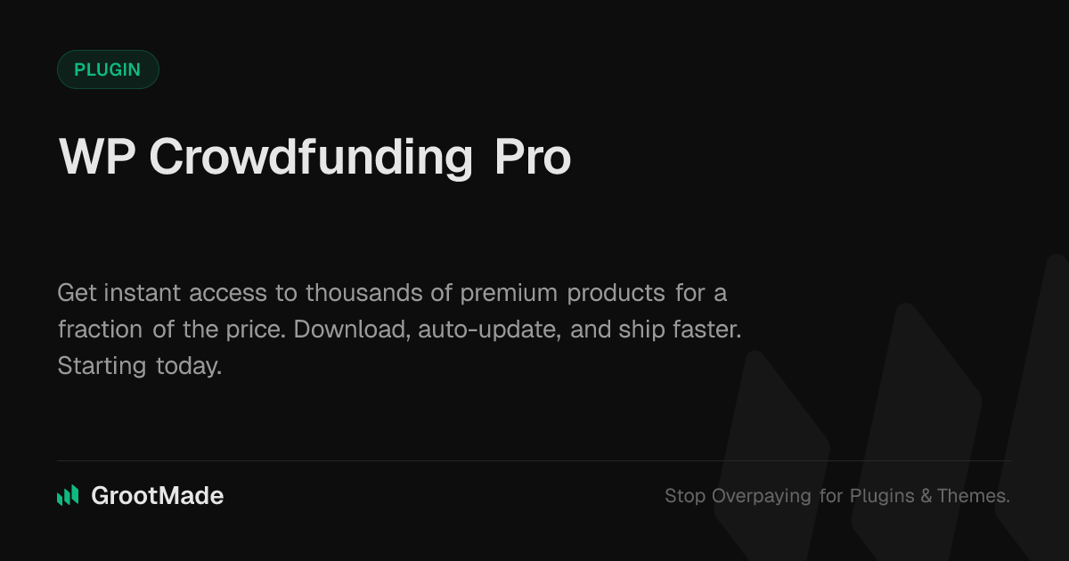 GrootMade is NOT affiliated with WP Crowdfunding Pro or its original author. WP Crowdfunding Pro™ is a trademark of its respective owner and use of it does not imply any endorsement or affiliation. This product has been forked under the GNU General Public License (GPL) and all non-GPL assets (such as proprietary images, fonts, and branding) have been removed. Distributing GPL-licensed code is 100% legal.