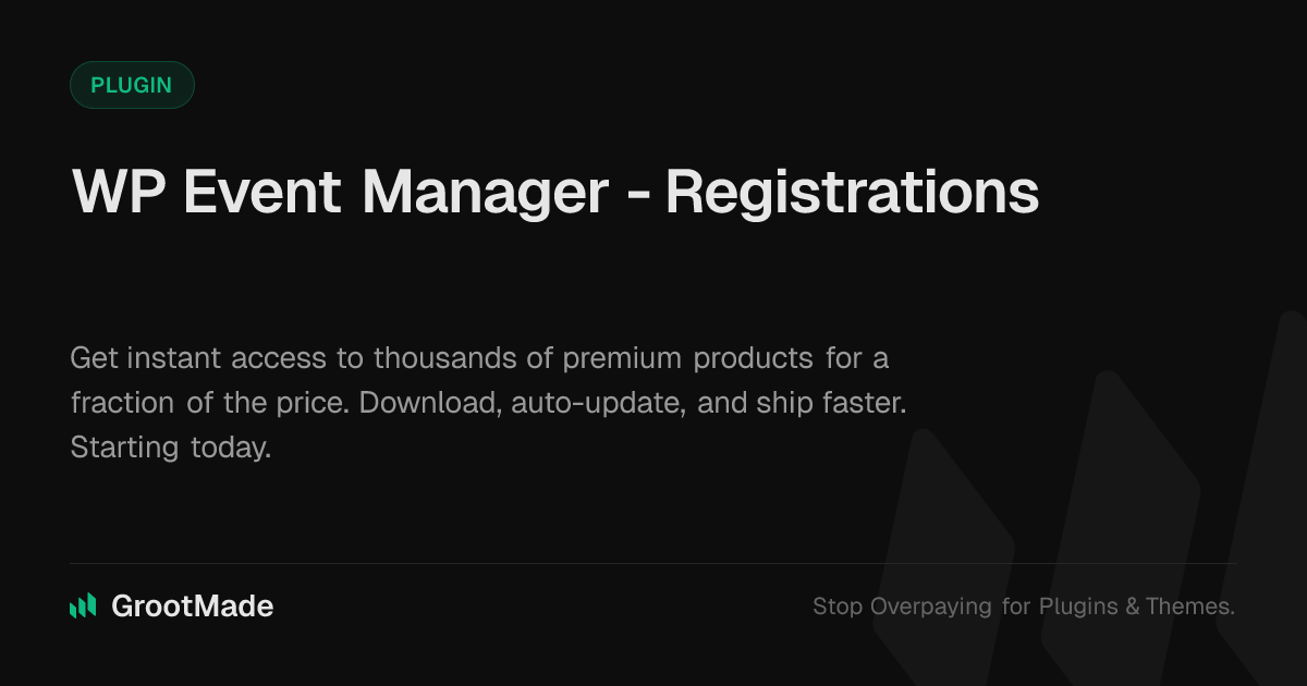 GrootMade is NOT affiliated with WP Event Manager - Registrations or its original author. WP Event Manager - Registrations™ is a trademark of its respective owner and use of it does not imply any endorsement or affiliation. This product has been forked under the GNU General Public License (GPL) and all non-GPL assets (such as proprietary images, fonts, and branding) have been removed. Distributing GPL-licensed code is 100% legal.
