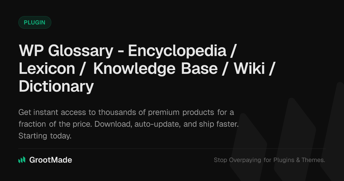 GrootMade is NOT affiliated with WP Glossary - Encyclopedia / Lexicon / Knowledge Base / Wiki / Dictionary or its original author. WP Glossary - Encyclopedia / Lexicon / Knowledge Base / Wiki / Dictionary™ is a trademark of its respective owner and use of it does not imply any endorsement or affiliation. This product has been forked under the GNU General Public License (GPL) and all non-GPL assets (such as proprietary images, fonts, and branding) have been removed. Distributing GPL-licensed code is 100% legal.