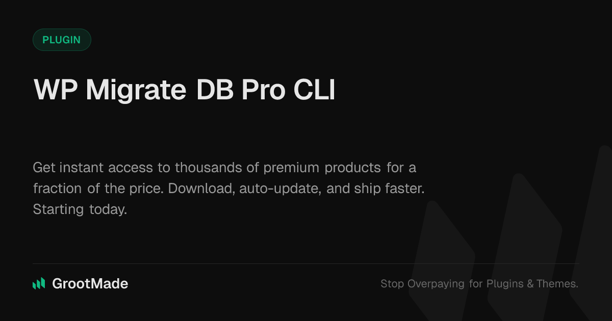 GrootMade is NOT affiliated with WP Migrate DB Pro CLI or its original author. WP Migrate DB Pro CLI™ is a trademark of its respective owner and use of it does not imply any endorsement or affiliation. This product has been forked under the GNU General Public License (GPL) and all non-GPL assets (such as proprietary images, fonts, and branding) have been removed. Distributing GPL-licensed code is 100% legal.