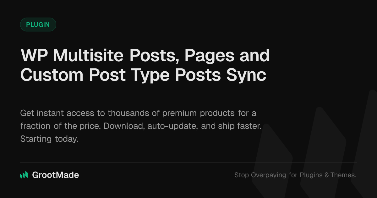 GrootMade is NOT affiliated with WordPress Multisite Posts, Pages and Custom Post Type Posts Sync or its original author. WordPress Multisite Posts, Pages and Custom Post Type Posts Sync™ is a trademark of its respective owner and use of it does not imply any endorsement or affiliation. This product has been forked under the GNU General Public License (GPL) and all non-GPL assets (such as proprietary images, fonts, and branding) have been removed. Distributing GPL-licensed code is 100% legal.