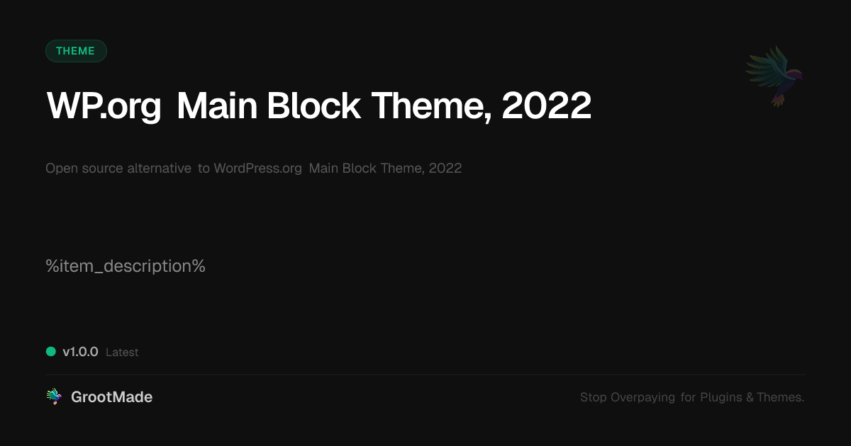 GrootMade is NOT affiliated with WordPress.org Main Block Theme, 2022 or its original author. WordPress.org Main Block Theme, 2022™ is a trademark of its respective owner and use of it does not imply any endorsement or affiliation. This product has been forked under the GNU General Public License (GPL) and all non-GPL assets (such as proprietary images, fonts, and branding) have been removed. Distributing GPL-licensed code is 100% legal.