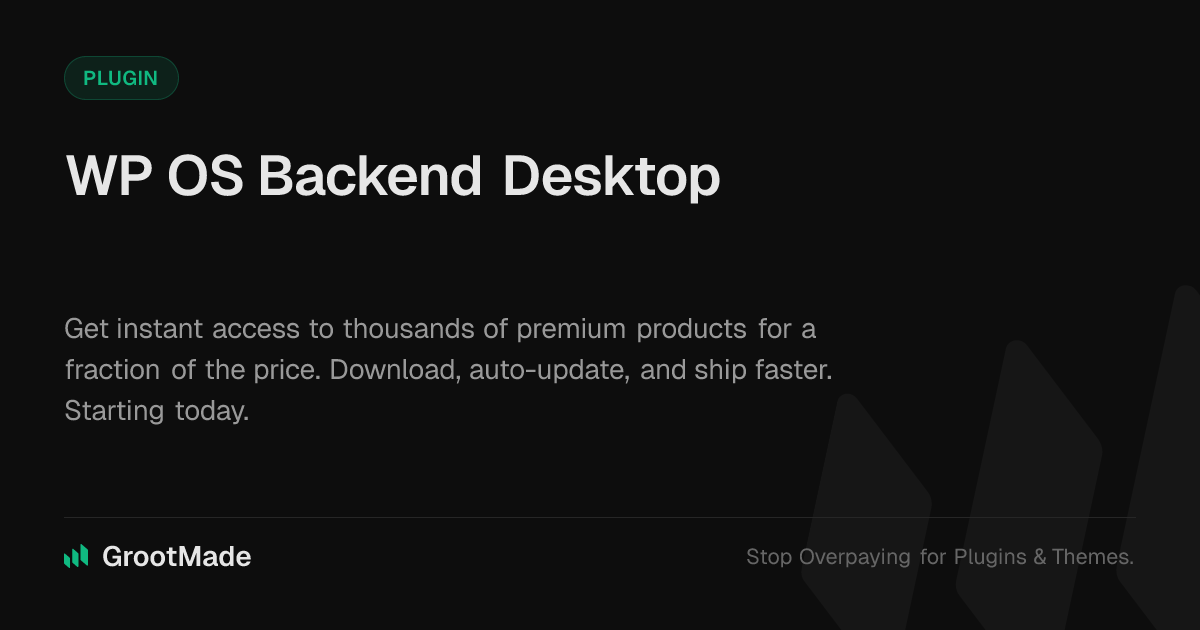 GrootMade is NOT affiliated with WP OS Backend Desktop or its original author. WP OS Backend Desktop™ is a trademark of its respective owner and use of it does not imply any endorsement or affiliation. This product has been forked under the GNU General Public License (GPL) and all non-GPL assets (such as proprietary images, fonts, and branding) have been removed. Distributing GPL-licensed code is 100% legal.