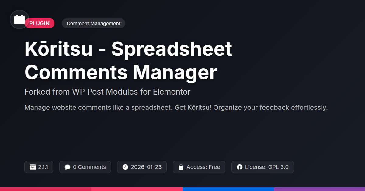 Ever felt like your website's comments section is a Wild West of digital dialogue? Are you tired of manually sifting through mountains of user feedback, wishing there was a more organized, dare I say, spreadsheet-like approach to managing it all? We get it. Developers and agencies alike often find themselves wrestling with a chaotic comment system, turning precious feedback into a jumbled mess. It's like trying to find a specific piece of data in a haystack, except the haystack is on fire and occasionally spits out spam. Well, what if I told you there's a way to bring order to this digital chaos? What if you could treat your user comments like a beautifully organized data set, complete with all the sorting, filtering, and analytical power you've come to expect from your favorite spreadsheet software, all within your favorite content management system? Sounds like a dream, right? But what if I told you this dream is now a tangible reality, courtesy of a brilliant fork from a very capable source? Get ready to say goodbye to comment chaos and hello to Kōritsu - Spreadsheet Comments Manager. This isn't just another plugin; it's your new best friend in the quest for streamlined, efficient, and dare we say, enjoyable comment management.