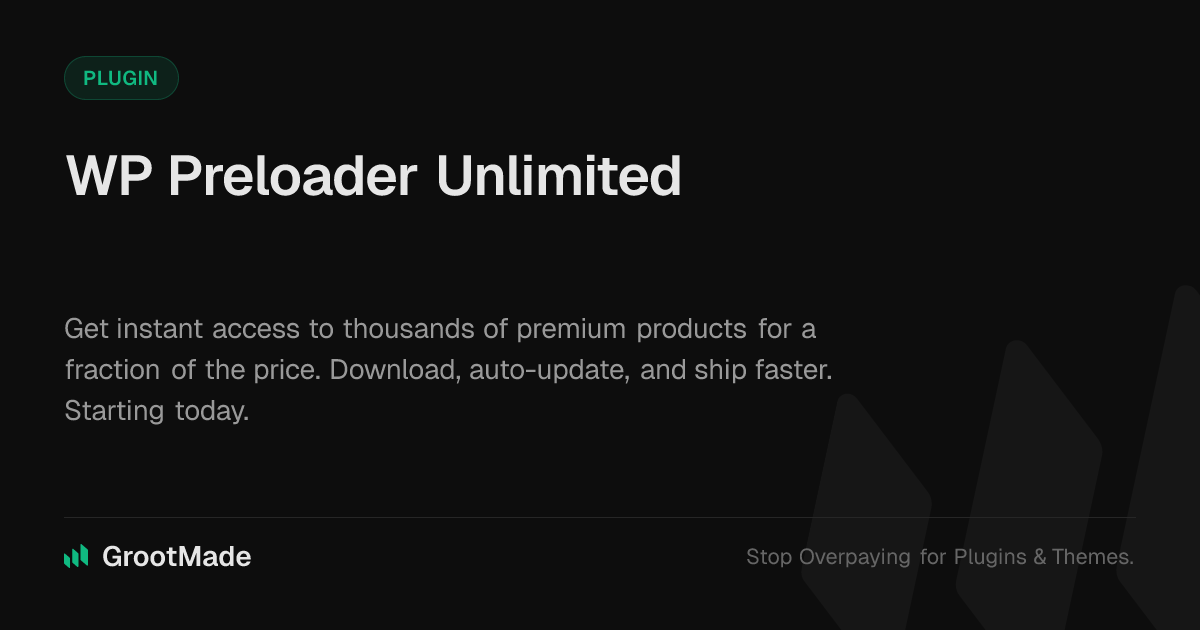 GrootMade is NOT affiliated with WordPress Preloader Unlimited or its original author. WordPress Preloader Unlimited™ is a trademark of its respective owner and use of it does not imply any endorsement or affiliation. This product has been forked under the GNU General Public License (GPL) and all non-GPL assets (such as proprietary images, fonts, and branding) have been removed. Distributing GPL-licensed code is 100% legal.