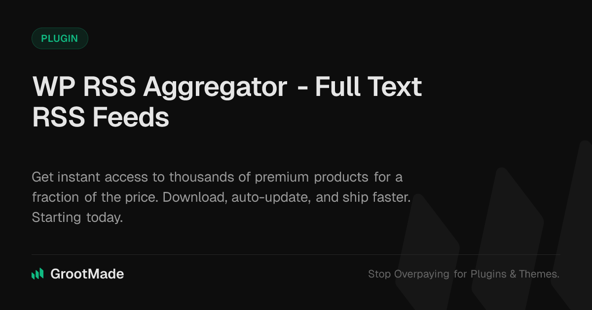 GrootMade is NOT affiliated with WP RSS Aggregator - Full Text RSS Feeds or its original author. WP RSS Aggregator - Full Text RSS Feeds™ is a trademark of its respective owner and use of it does not imply any endorsement or affiliation. This product has been forked under the GNU General Public License (GPL) and all non-GPL assets (such as proprietary images, fonts, and branding) have been removed. Distributing GPL-licensed code is 100% legal.