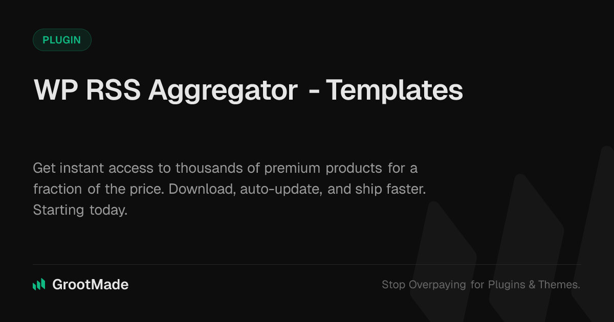 GrootMade is NOT affiliated with WP RSS Aggregator - Templates or its original author. WP RSS Aggregator - Templates™ is a trademark of its respective owner and use of it does not imply any endorsement or affiliation. This product has been forked under the GNU General Public License (GPL) and all non-GPL assets (such as proprietary images, fonts, and branding) have been removed. Distributing GPL-licensed code is 100% legal.