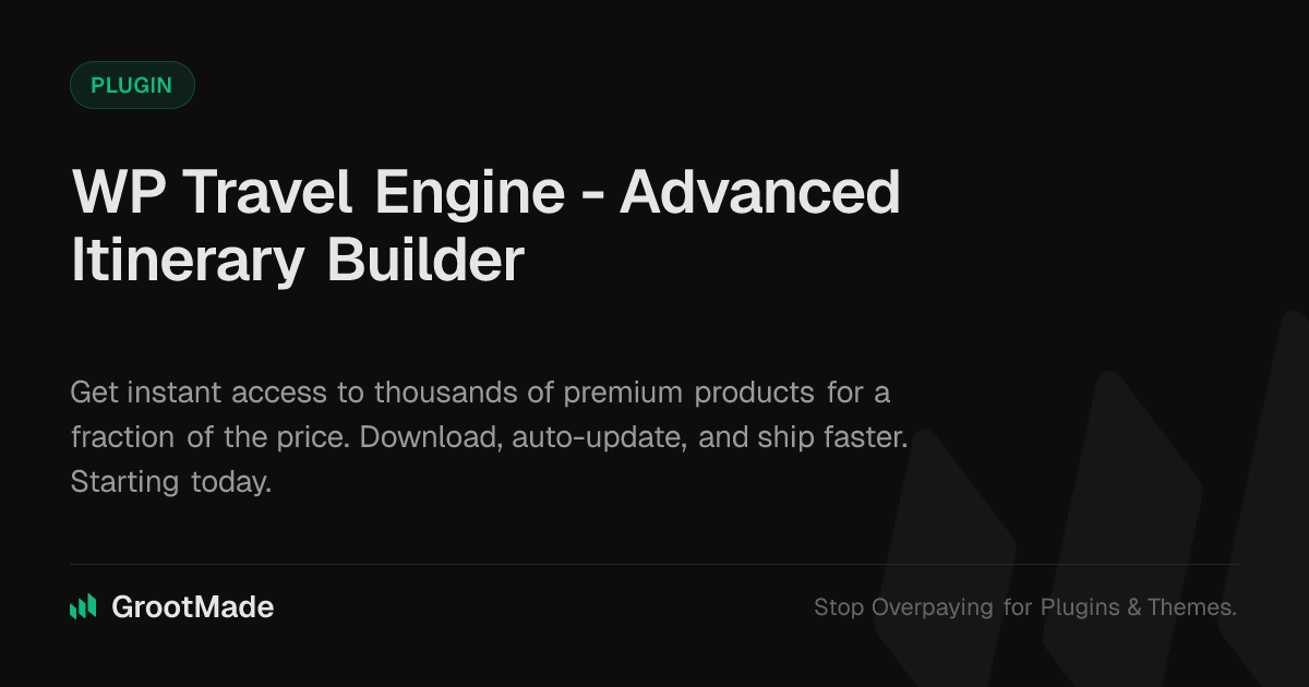 GrootMade is NOT affiliated with WP Travel Engine - Advanced Itinerary Builder or its original author. WP Travel Engine - Advanced Itinerary Builder™ is a trademark of its respective owner and use of it does not imply any endorsement or affiliation. This product has been forked under the GNU General Public License (GPL) and all non-GPL assets (such as proprietary images, fonts, and branding) have been removed. Distributing GPL-licensed code is 100% legal.