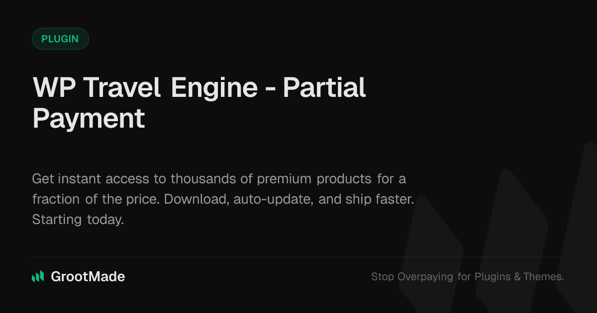GrootMade is NOT affiliated with WP Travel Engine - Partial Payment or its original author. WP Travel Engine - Partial Payment™ is a trademark of its respective owner and use of it does not imply any endorsement or affiliation. This product has been forked under the GNU General Public License (GPL) and all non-GPL assets (such as proprietary images, fonts, and branding) have been removed. Distributing GPL-licensed code is 100% legal.