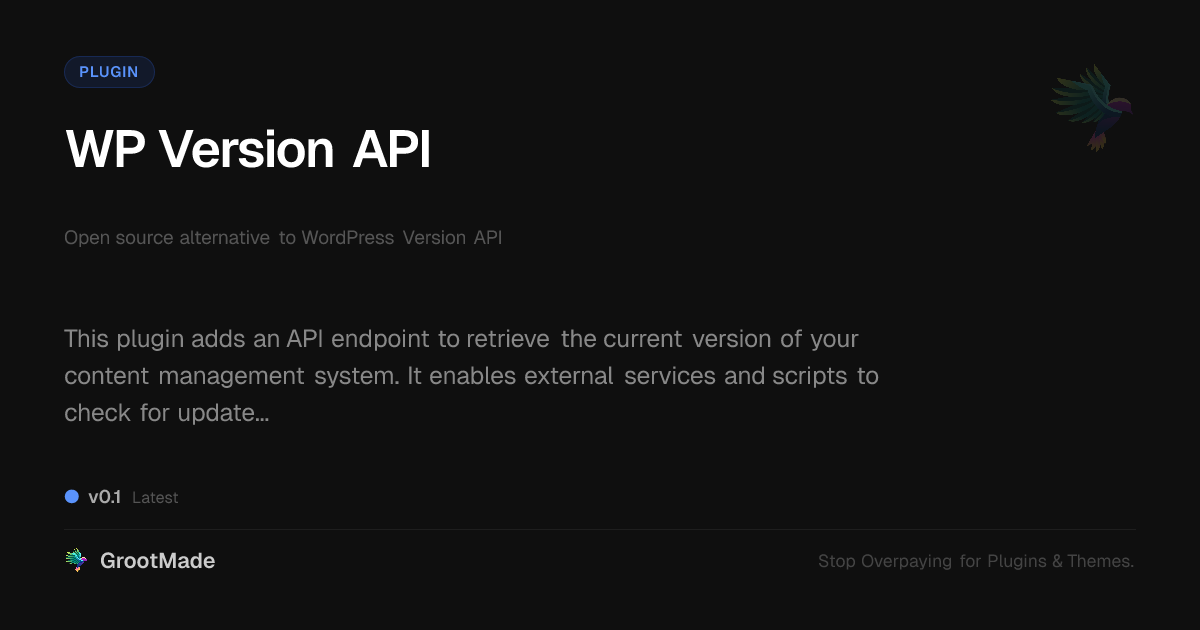 GrootMade is NOT affiliated with WordPress Version API or its original author. WordPress Version API™ is a trademark of its respective owner and use of it does not imply any endorsement or affiliation. This product has been forked under the GNU General Public License (GPL) and all non-GPL assets (such as proprietary images, fonts, and branding) have been removed. Distributing GPL-licensed code is 100% legal.