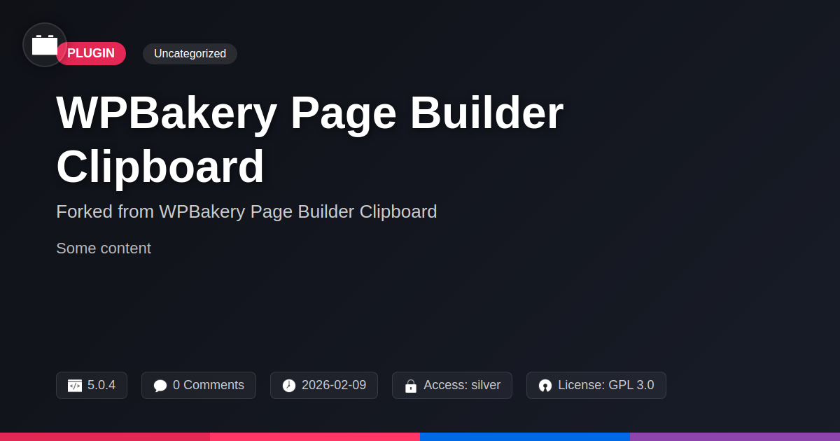 GrootMade is NOT affiliated with WPBakery Page Builder Clipboard or its original author. WPBakery Page Builder Clipboard™ is a trademark of its respective owner and use of it does not imply any endorsement or affiliation. This product has been forked under the GNU General Public License (GPL) and all non-GPL assets (such as proprietary images, fonts, and branding) have been removed. Distributing GPL-licensed code is 100% legal.