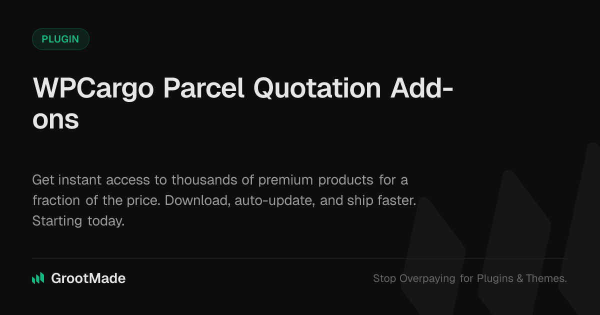 GrootMade is NOT affiliated with WPCargo Parcel Quotation Add-ons or its original author. WPCargo Parcel Quotation Add-ons™ is a trademark of its respective owner and use of it does not imply any endorsement or affiliation. This product has been forked under the GNU General Public License (GPL) and all non-GPL assets (such as proprietary images, fonts, and branding) have been removed. Distributing GPL-licensed code is 100% legal.