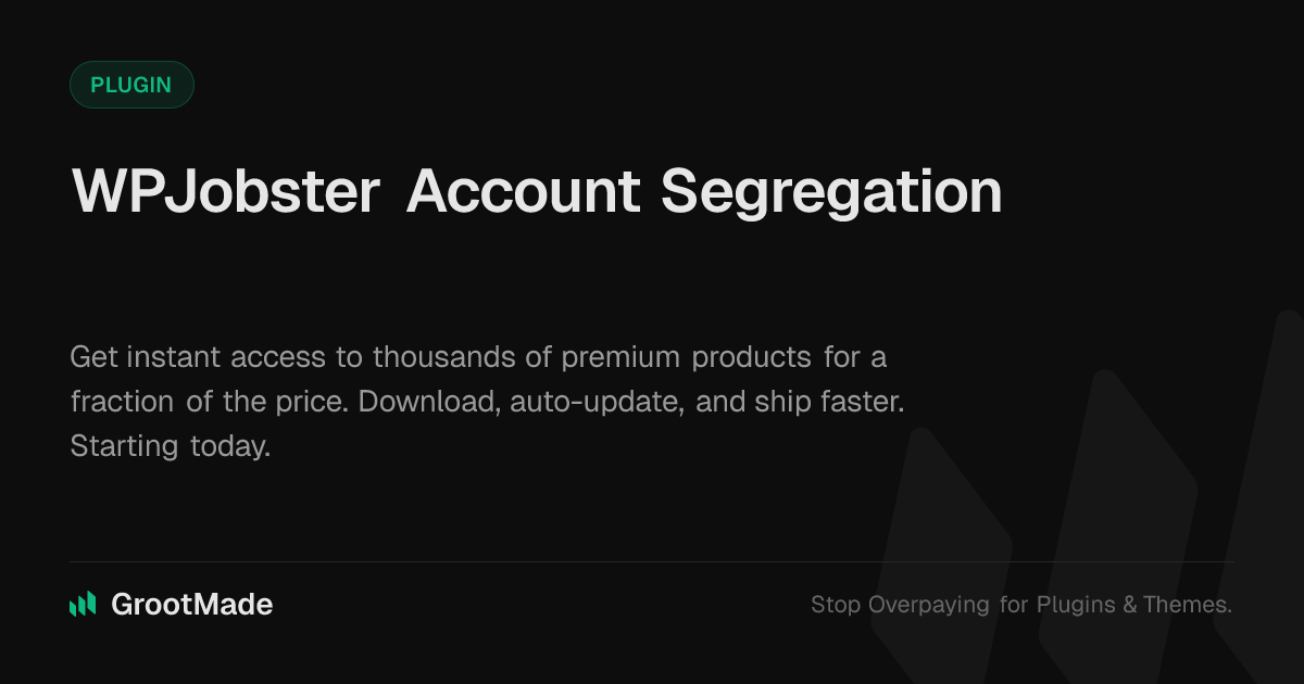 GrootMade is NOT affiliated with WPJobster Account Segregation or its original author. WPJobster Account Segregation™ is a trademark of its respective owner and use of it does not imply any endorsement or affiliation. This product has been forked under the GNU General Public License (GPL) and all non-GPL assets (such as proprietary images, fonts, and branding) have been removed. Distributing GPL-licensed code is 100% legal.