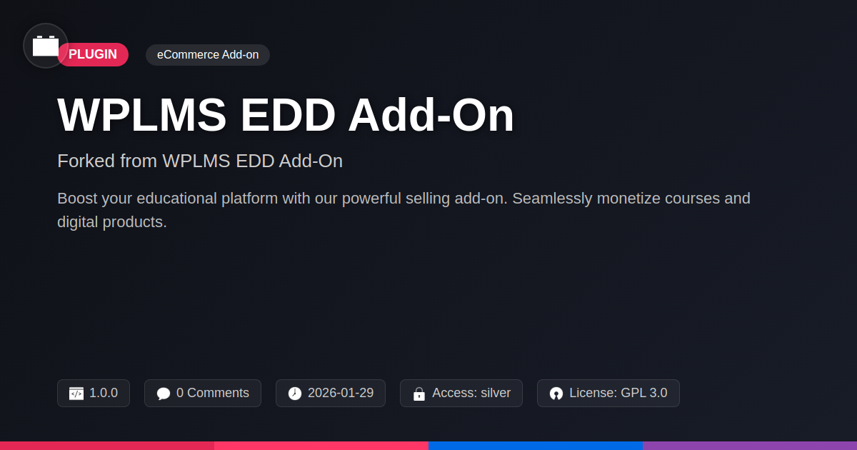 GrootMade is NOT affiliated with WPLMS EDD Add-On or its original author. WPLMS EDD Add-On™ is a trademark of its respective owner and use of it does not imply any endorsement or affiliation. This product has been forked under the GNU General Public License (GPL) and all non-GPL assets (such as proprietary images, fonts, and branding) have been removed. Distributing GPL-licensed code is 100% legal.
