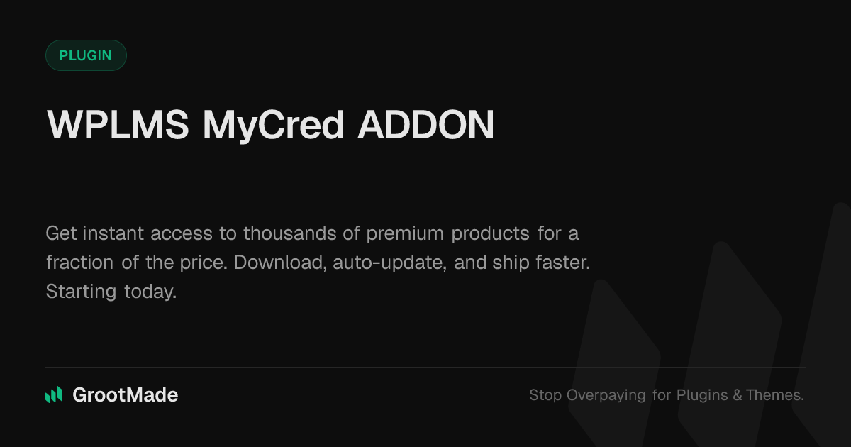 GrootMade is NOT affiliated with WPLMS MyCred ADDON or its original author. WPLMS MyCred ADDON™ is a trademark of its respective owner and use of it does not imply any endorsement or affiliation. This product has been forked under the GNU General Public License (GPL) and all non-GPL assets (such as proprietary images, fonts, and branding) have been removed. Distributing GPL-licensed code is 100% legal.